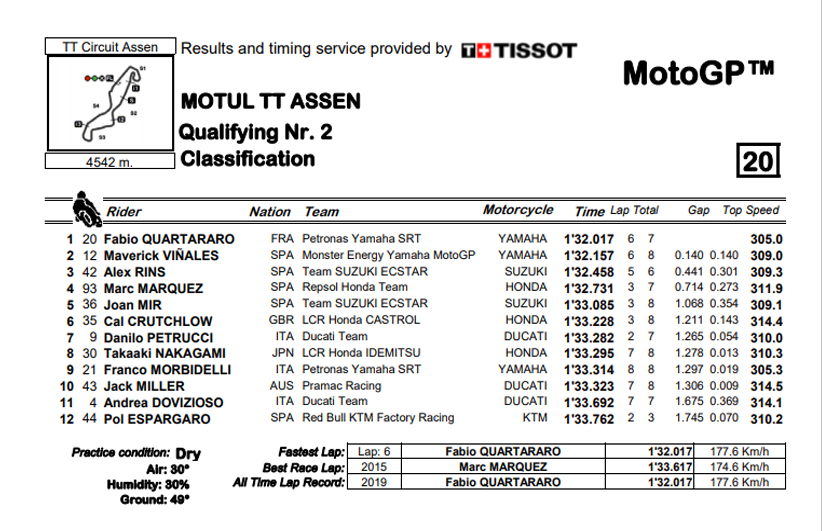A um minuto do final, Quartararo fez de novo magia, para se colocar à frente, baixando mesmo Márquez desse modo para a segunda fila, pela primeira vez este ano, o que faria antever uma corrida titânica amanhã. Atrás, Mir, Crutchlow e Nakagami apareciam até ao 7º lugar e, com Petrucci 8º, Dovizioso não conseguia melhor que 11º, configurando dificuldades para a Ducati em Assen, com a KTM de Espargaró atrás a fechar a 4ª fila.