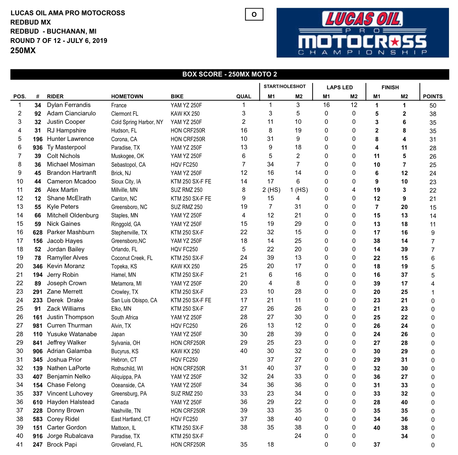 Na classificação final do dia, Dylan Ferrandis (1º/1º) conseguiu a primeira “dobradinha” da sua carreira no AMA Motocross 250. O piloto da Yamaha reduziu a desvantagem no campeonato para Adam Cianciarulo (5º/2º) de 37 para 25 pontos. Justin Cooper foi 3º nesta ronda e ocupa agora a mesma posição na classificação provisória.