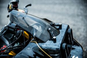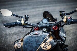 Os pneus são Rotobox, montados em jantes de carbono com cinco raios de, o que se traduzi numa redução significativa do peso e um melhore controlo das reações da moto. Os poisa pés reguláveis e anti queda são da Rizoma, enquanto o painel digital redondo é totalmente digital.