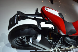 O banco do pendura tem um novo design mais afilado e agressivo e o escape também é semelhante ao assimétrico da 1200. Resultado as três Ducati Monster têm agora um design semelhante, sendo que a maior alteração na 821 é ao nível da electrónica com full ride-by-wire, controle de tração configurável em 8 níveis distintos, três níveis de ABS e três mapas de motor.
