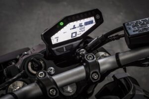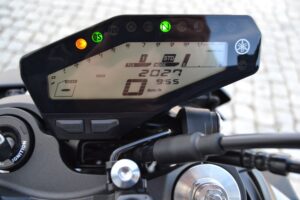 A electrónica permite dois modos de controle de tracção, 1 e 2, sendo que se gostam de tirar partido da facilidade com que a MT09 faz “wheelies” então o modo 1 é o recomendável. Aconselhamos uma boa dose de self-control associada já que a adrenalina cria habituação…