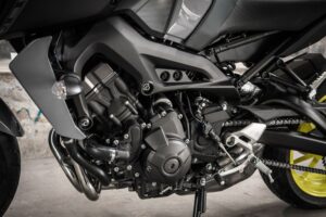 O motor crossplane de 3 cilindros da Yamaha garante uma distribuição linear de potência, realidade que é evidente na MT-09, o torque está sempre presente desde baixas rotações. É fácil subir em 6ª velocidade das 2.000 rpm e a aceleração é progressiva e enérgica sendo que o torque máximo de 87.5 Nm é atingido às 8.500 rpm.