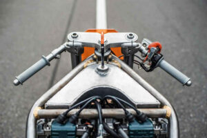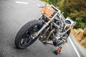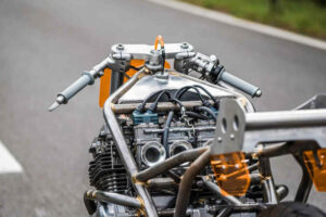 O motor que equipa esta ‘ave rara’ foi o utilizado na Suzuki GCS1100 precisamente de 1100cc e que estava em perfeito estado de conservação. Depois de possuir motor o passo seguinte foi a colocação de umas forquilhas retiradas da Suzuki GSX. O alternador foi também substituído por uma bateria de iões de lítio e para colmatar a saída do alternador foi instalado um depósito de alumínio com capacidade de 1,5 litros. Com todas essas modificações o peso final desta obra de arte ficou nos 168 quilos.