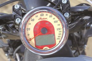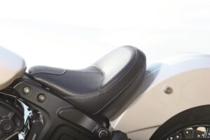 Aliás, o comportamento da Scout Sixty é uma agradável surpresa em praticamente todos os campos. Começa desde os primeiros momentos em que nos sentamos nela. O seu assento tem um desenho muito confortável. Encaixado no “v” feito pelo guarda-lamas traseiro e o quadro, este assento garante um bom apoio para todo o rabo e a zona traseira funciona como um pequeno encosto. Ao fim dos 200 km realizados durante o dia da apresentação estávamos bem para continuar. A sua reduzida altura facilita bastante a quem se inicia no mundo das duas rodas, um tipo de cliente que a Indian procura. A posição de condução, com os pés para a frente e braços um pouco elevados, acaba por ser boa para rolar em estrada. Rolar é algo que encaixa bem na Scout Sixty, se bem que o seu motor tem genica para mais.