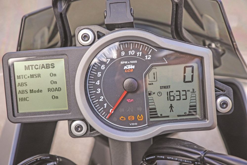 A Super Duke GT é uma máquina infernal, com um chassis muito competente e travões a condizer. Em cima disto está todo o state of the art que a electrónica tem para ofecerer nos dias de hoje, como por exemplo, os vários modos de mapa do motor (Sport, Street e Rain) que também influenciam o grau de intervenção do controlo de tracção (MTC). Mas se pensa que é tudo, está enganado. A suspensão permite um controlo variável do amortecimento (Confort, Normal e Sport) assim como um ajuste contínuo em relação à carga sobre a moto.