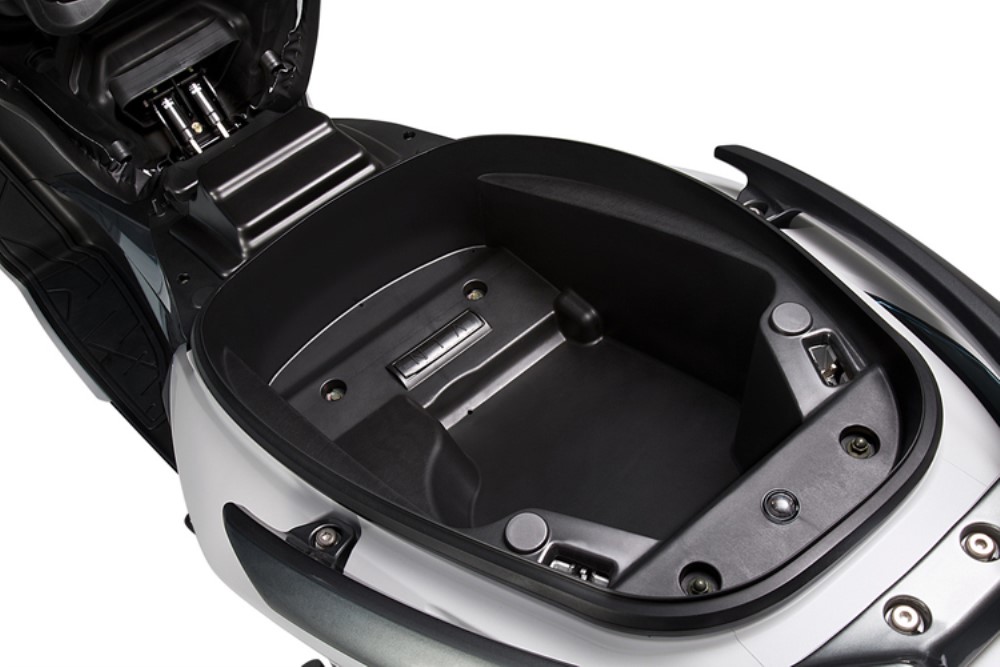 O banco de dois níveis com acolchoamento especial, garante um bom apoio do fundo das costas para ambos os dois ocupantes e a qualidade geral de construção e acabamento desta desta maxiscooter parece bem acima da média.