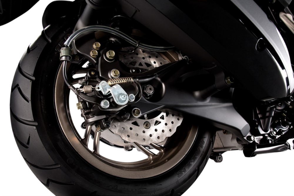 Apesar de uma vocação maios desportiva a KYMCO Xciting 400i conta com uma suspensão, que consegue filtrar a maior parte das irregularidades das estradas das nossas cidades, e as rodas de quinze e catorze polegadas, na frente e na traseira respectivamente, contribuem bastante nesse sentido.