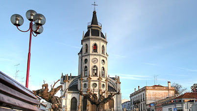 Igreja Matriz de Reguengos de Monsaraz (Coord. GPS 38.424231, -7.534491), a sua construção teve início a 27 de outubro de 1887. A torre sineira está no meio da fachada.