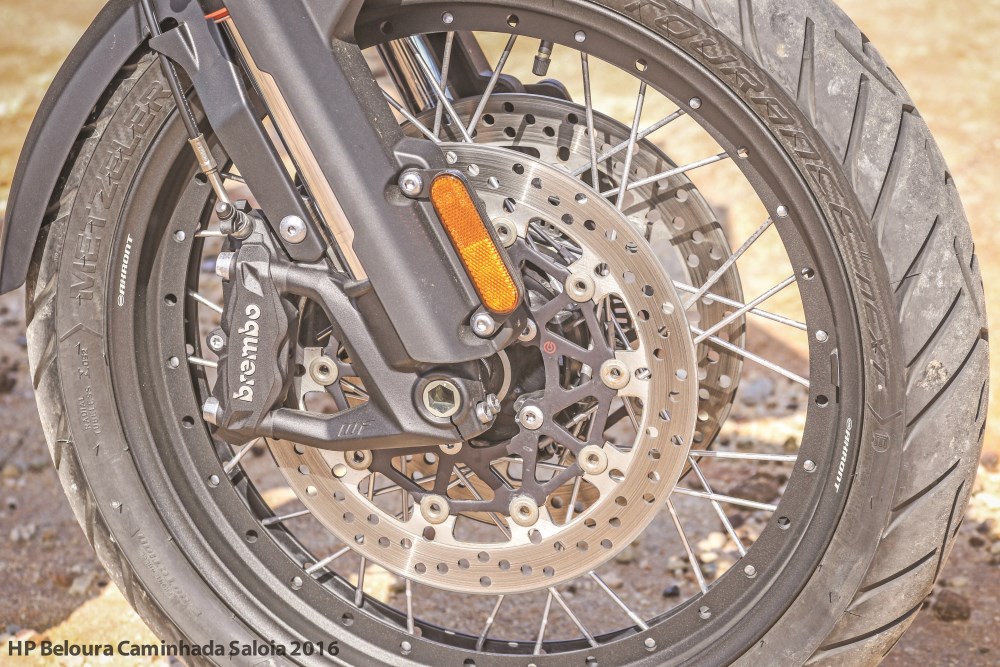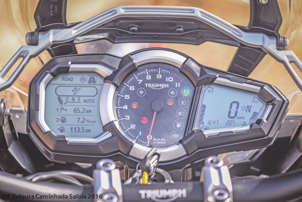 Convém mencionar que é preciso perder algum tempo a “estudar” todas as possibilidades de configuração da atitude dinâmica desta moto. Há três botões principais, um que permite escolher os modos de condução (Rain, Road e Off Road), outro que com setas para navegar no menu e mais um junto ao indicador esquerdo que faz de “Enter”. Isto significa, que fazer avisos luminosos com os máximos obriga a um movimento muito pouco natural do polegar esquerdo, logo criticável. Ter esta função no indicador ainda é a melhor solução, sobretudo para quem não tem mãos de jogador da NBA.
