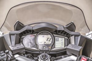 embraiagem A&S e também na adopção da sexta velocidade para a caixa de velocidades. A nova embraiagem “Assist and Slipper” torna o accionamento da embraiagem 20% mais suave, com o novo sistema de molas que ajuda a que quer nas subidas de caixa quer nas reduções, todo o sistema tenha menos esforço de actuação tornando a condução ainda mais fácil e relaxada. A nova iluminação totalmente em LED melhora drasticamente a capacidade de iluminação, com os dois faróis frontais a terem médios e máximos simultaneamente, mas a FJR estreia também um novo sistema de luzes de curva adaptativas, um sistema que dispõe de três luzes por cima dos faróis normais e que vão acendendo progressivamente com a inclinação da moto para iluminar os habituais ângulos mortos em curva. O conjunto dos piscas e farolim traseiro passa também para a tecnologia LED e tem um desenho muito bem conseguido. O painel de instrumentos também foi redesenhado, usando agora novos caracteres e um tratamento anti-reflexo que melhora a leitura diurna com muita luz. A “grande” novidade, acaba por ser a nova caixa de seis velocidades, uma das principais falhas apontadas à moto quer pela imprensa, quer pelos clientes, que nunca entenderam uma moto turística sem uma sexta relação que permitisse ao motor rolar mais solto em altos regimes. A Yamaha opta por fim por fazer a tão esperada mudança, e consegue reduzir a rotação do motor em 10% na relação final, criando no processo uma caixa de velocidades mais suave, precisa e leve. Finalmente!
