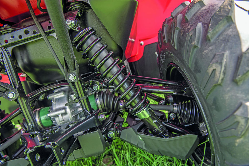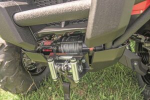 Apesar do acionamento da transmissão poder parecer ser demasiado antiquado, a Yamaha mantêm a aposta na alavanca para que o condutor possa selecionar o modo de tração traseira ou tracção total. Este modo de acionamento mecânico permite escolher a opção mais adequada sem perder muito tempo, podendo sem encontrado na versão SE um sistema On-Command com bloqueio de diferencial que permitirá ao Kodiak ultrapassar obstáculos ainda mais exigentes sem grande dificuldade. A isto juntamos a transmissão Ultramatic desenvolvida pela Yamaha para muitos dos seus modelos. Uma transmissão automática que é reconhecida como um dos melhores sistemas CVT no mercado por força da utilização de uma correia em V que garante um funcionamento suave não deixando mesmo que surjam os sempre incómodos abanões e solavancos mesmos nas descidas mais inclinadas onde somos obrigados a recorrer à utilização dos travões.