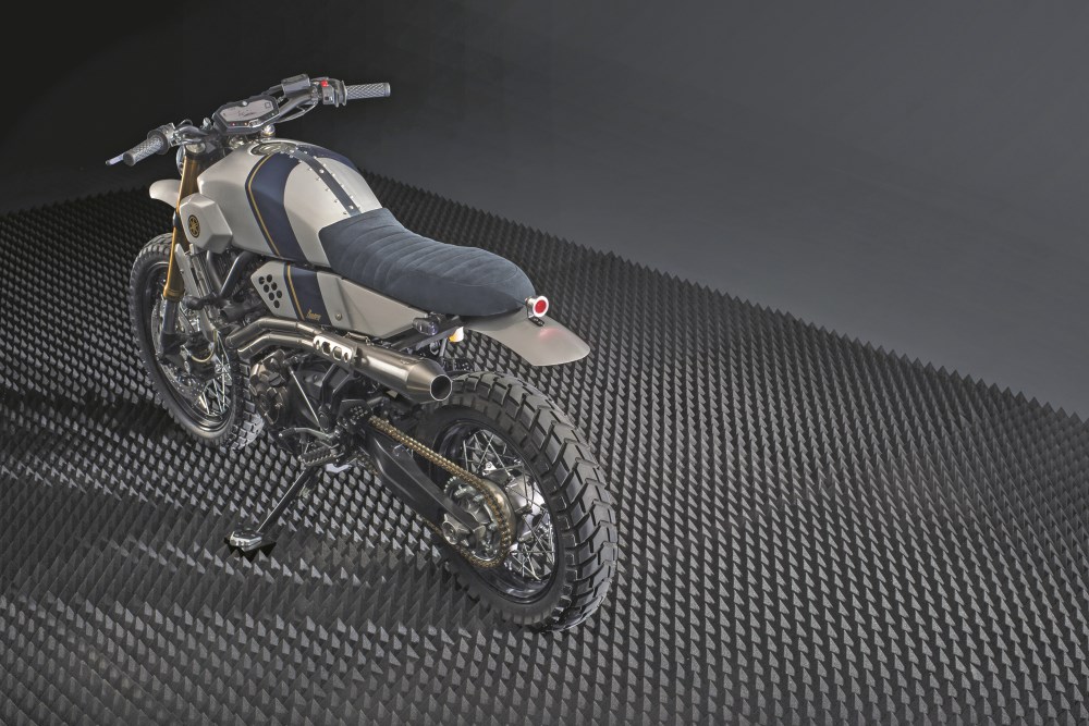 A estrutura em alumínio fresado da CNC, que suporta as coberturas do depósito de combustível, foi também lixada e polida para criar uma vista da parte superior da moto espetacular. O guiador Renthal proporciona elevação suficiente para possibilitar a nova posição de condução e o banco foi elevado 6cm para acompanhar esta nova posição de condução. Tal foi conseguido graças a uma extensão aparafusável que pode ser instalada em qualquer XSR700. Um revestimento em pele acamurçada confere estilo ao banco, que mantém a fechadura original. Para continuar confortável e prática e ao mesmo tempo que manter uma imagem impecável em estradas mais irregulares, as forquilhas de série foram trocadas por forquilhas invertidas da MT-09 Tracer.