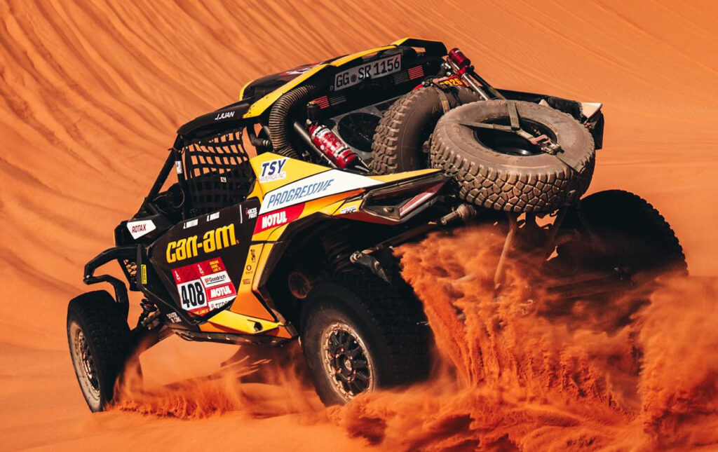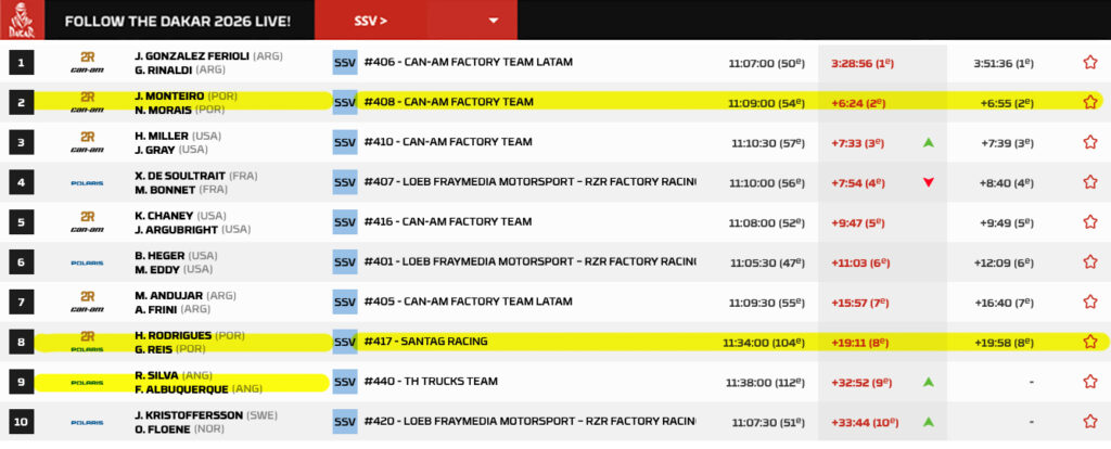 Na Etapa ganha por Al Attiyah nos carros, Ferioli/Rinaldi e Monteiro/Morais (abaixo) estiveram toda a etapa na disputa pela vitória, os portugueses acabando a escassos 6’55” dos vencedores, com Miller/Gray a vir detrás na fase final para completarem o pódio ao ultrapassar Xavier De Soultrait.