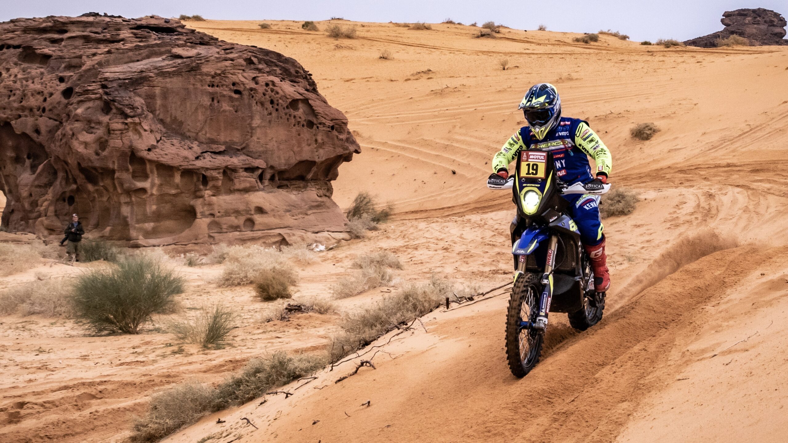 Com um percurso rápido, mas por vezes sinuoso, a serpentear entre desfiladeiros rochosos e trilhos de areia, a etapa que ligou Alula a Ha’Il permitiu a Rui Gonçalves exibir os seus dotes de condução neste tipo de condições ao mesmo tempo que demonstrava as verdadeiras capacidades da sua Sherco FE 450 Rally.
