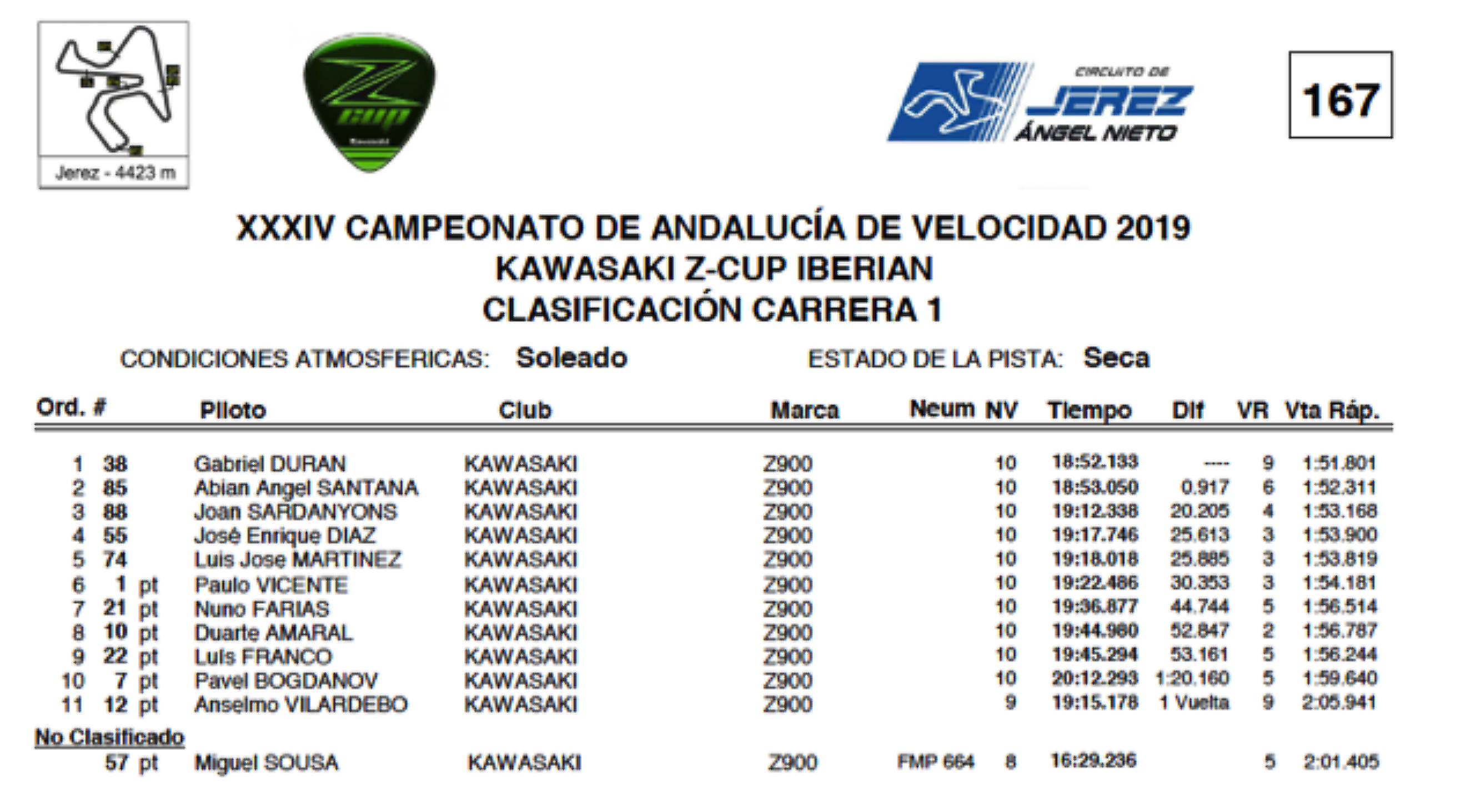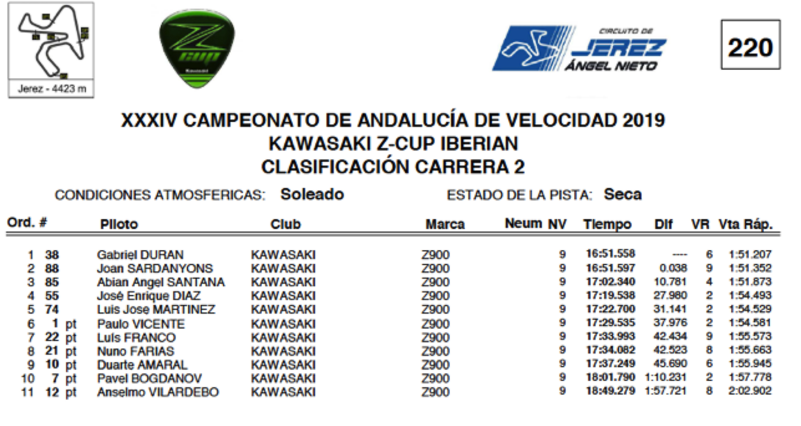 Estava dado o mote! Lá na frente, Abián e “turbito” lutam pela vitória em todas as voltas, ficando esta para o impressionante Gabriel Durán que vence Abián por menos de 1 segundo! Mais atrás, a hierarquia dos cronometrados manteve-se mas com Galindo (Z74) a superar Vicente seguido de Farias (Z21) sempre a subir de ritmo. Nas voltas finais, Amaral (Z10) ainda consegue superar Franco (Z22) para o último lugar do pódio da “portuguesa” por somente 3 décimas!