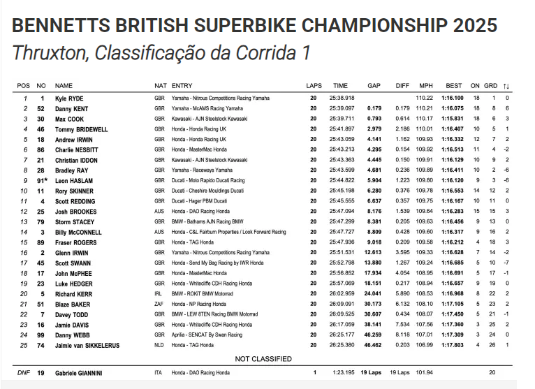 Após um início de temporada mediano, Kyle Ryde está realmente a recuperar. Regressando à vitória em 2025 nos altos e baixos de Brands Hatch, o piloto da Nitrous Competitions Racing (antiga OMG Racing) dominou a ação no sábado em Thruxton, culminando uma semana em que tudo se falou sobre a chegada de Glenn Irwin (apenas 16º e fora da zona de pontuação). Largando da pole position, ele administrou a sua moto, recursos e, principalmente, pneus para dar o seu melhor na final. Esta vitória significativa permite-lhe conquistar alguns pontos no campeonato, ficando a 24 do líder Bradley Ray, que inexplicavelmente está em oitavo, atrás de Christian Iddon.
