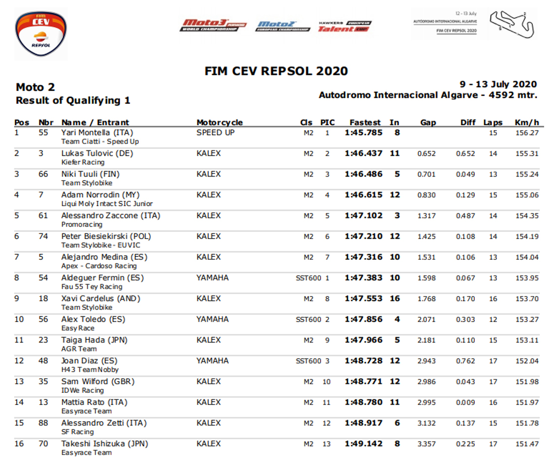Yari Montella da Speed up Ciatti replicou na primeira sessão qualificativa o domínio que já exercera nos Livres com um tempo de 1:45.785, aliás o único abaixo dos 1:46, deixando atrás de si uma ordem ligeiramente alterada, pois Lukas Tulovic suplantou o Finlandês Nikki Tuuli no lugar seguinte e Adan Norrodin veio por sua vez bater Alex Zaccone para o 4º lugar.
