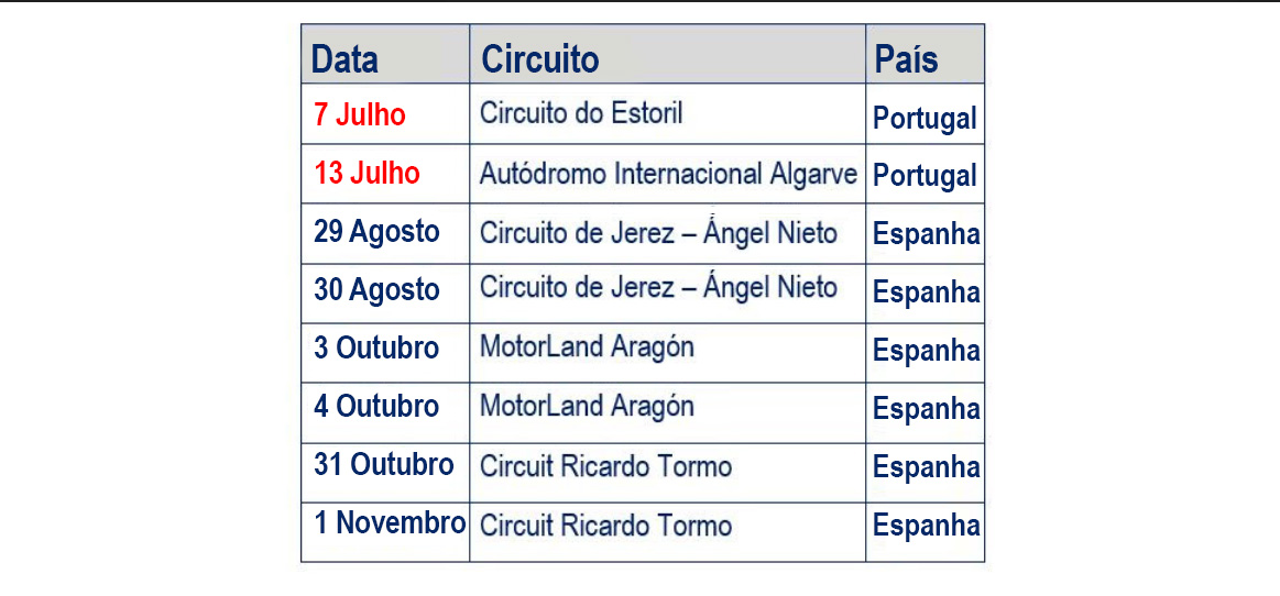 As datas e circuitos, bem como a capacidade do paddock e a possibilidade de presença de espectadores, estão sujeitos à evolução da pandemia e às atualizações feitas aos regulamentos pelas autoridades competentes, por isso fiquem atentos a atualizações.