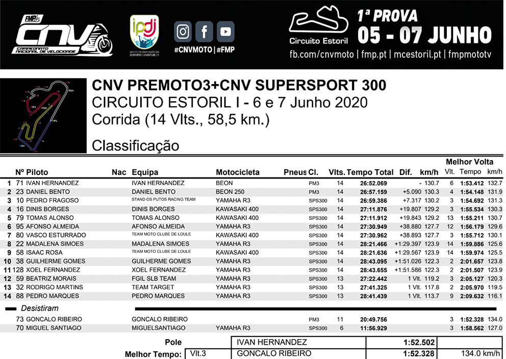 Depois de liderar a prova de Pré-Moto3 na sua BeOn até 4 voltas do fim, o Campeão em título Gonçalo Ribeiro acabou suplantado pela moto semelhante de Ivan Hernandez, deixando Daniel Bento no segundo lugar do pódio com outra BeOn e a primeira R3 da Copa de Supersport 300 do Stand Os Putos colocada em terceiro da geral.