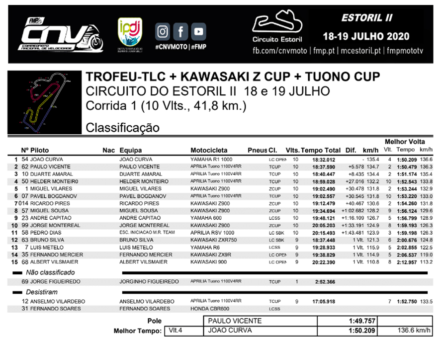 João Curva impôs-se com a vitória e melhor volta da corrida em 1:50.209 na sua Yamaha R1 do Troféu TLC ao crescente exército de motos da Copa Aprilia /Kawasaki que perfizeram os 8 lugares seguintes na primeira corrida do TLC/Kawasaki/Tuono Cup, com vantagem entre estas para Paulo Vicente e Duarte Amaral, que completaram o pódio nas suas Tuono 1100 V4RR.