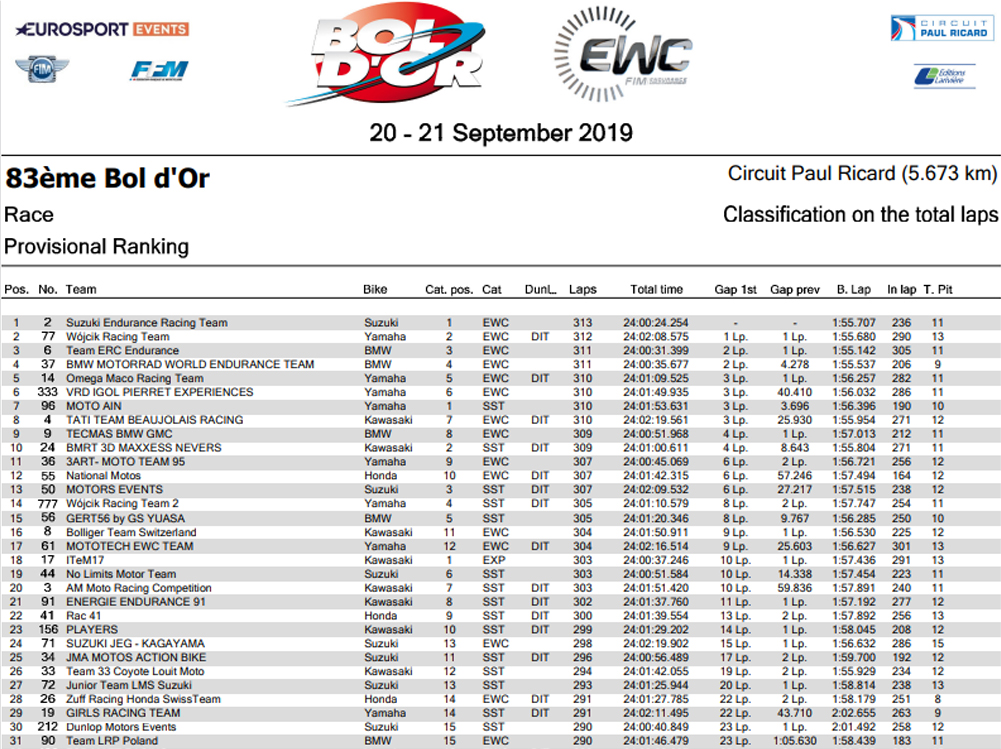 Depois de ter sido suspenso ontem à noite por causa de mau tempo extremo e remarcado para arrancar às 6:00 da manhã de hoje, as 24 H do Bol D’Or de 2019 acabaram por ser ganhas pela Suzuki SERT.