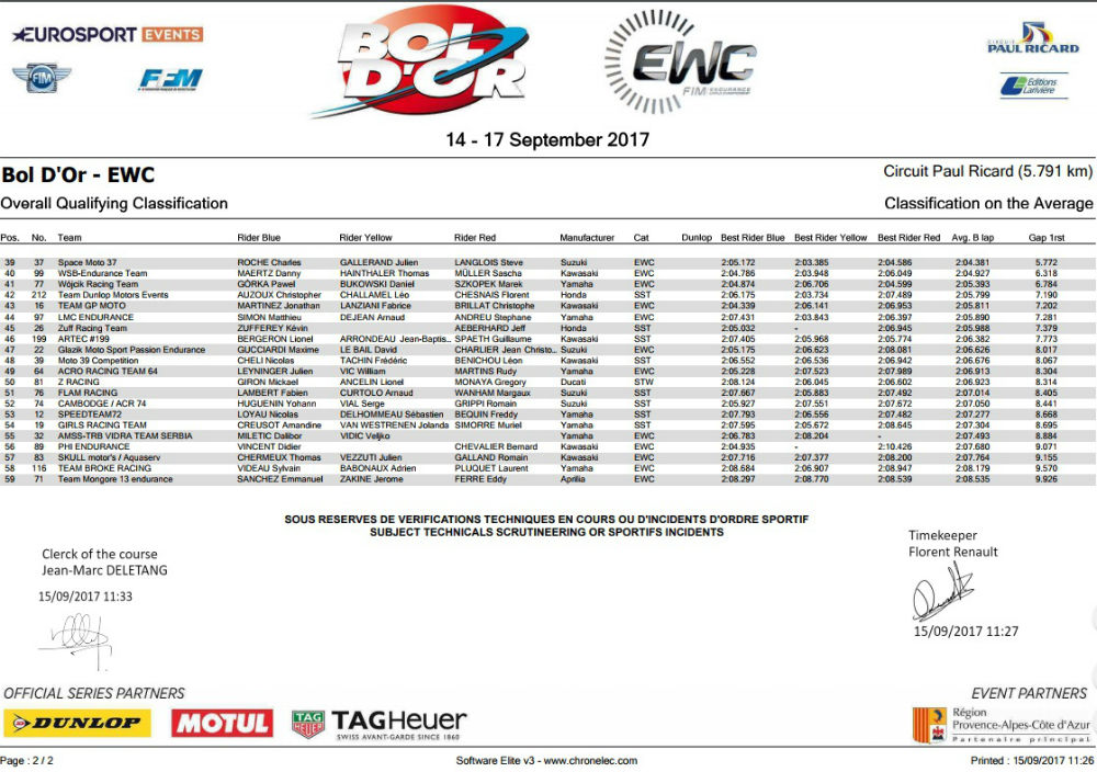 Randy de Puniet foi o autor da volta mais rápida ao rodar em 1m57,532s e relegando a equipa da Yamaha Austria Racing Team (YART) com Broc Parkes, Marvin Fritz e Kohta Nozane, para a segunda posição a 0,306s, enquanto o terceiro melhor tempo foi alcançado pelos homens da FCC TSR Honda France, com Josh Hook, Alan Techer e Freddy Foray, que aos comandos da Fireblade SP2 realizaram a melhor volta em 1m58,946s a 0,337s da pole position