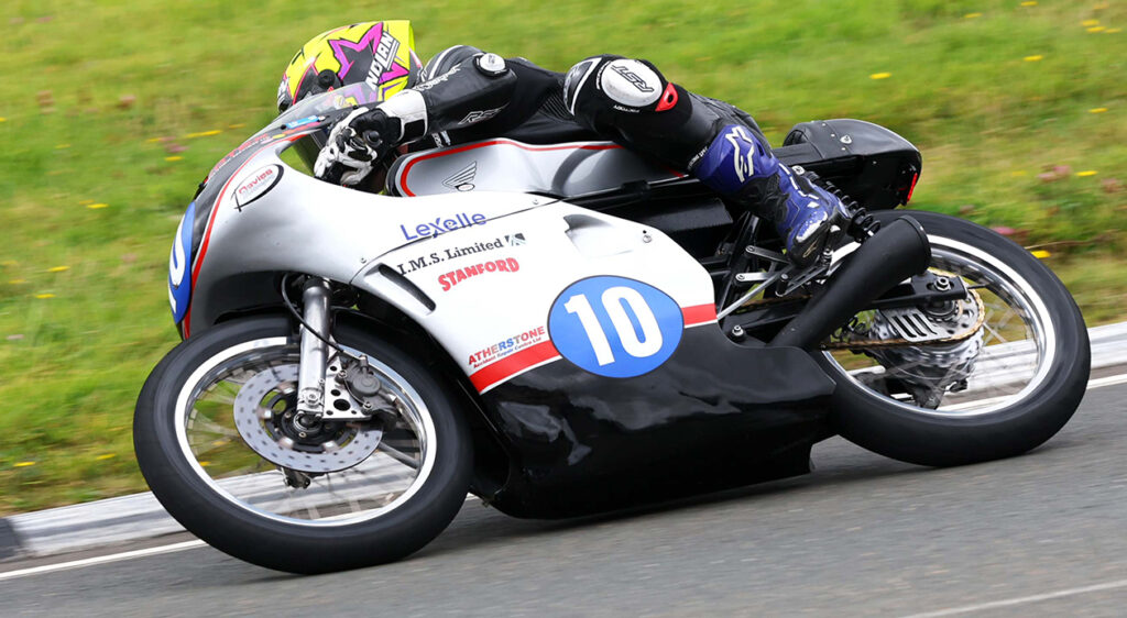 Dean Harrison (Craven Classic Matchless) completou o pódio em terceiro lugar, depois de o líder inicial John McGuinness (Winfield Paton) ter abandonado devido a um furo.