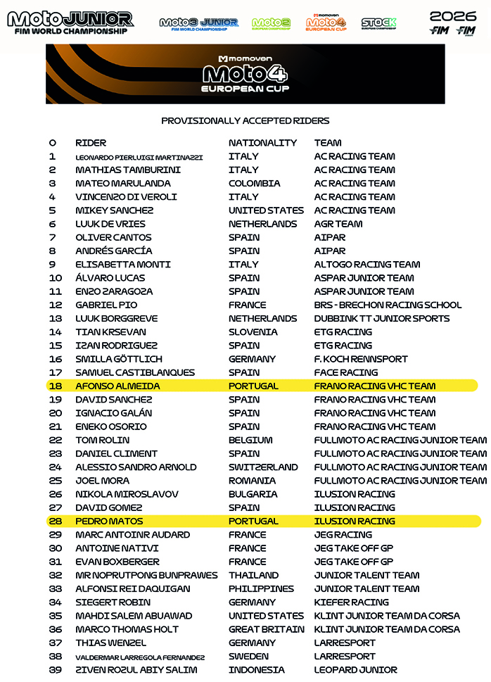 As listas de pilotos cujas inscrições foram provisoriamente aceites para o Campeonato do Mundo MotoJunior 2026 foram divulgadas, e no nosso caso é bom ver vários portugueses inscritos na Moto4 e nas Stock, embora estejamos sem representação nas Moto3 e nas Moto2.