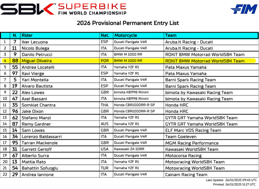 Agora, com a lista provisória de inscritos para a temporada 2026 do Campeonato do Mundo de Superbike MOTUL já divulgada, os pilotos permanentes e as suas equipas estão confirmados para a disputa do título na próxima temporada.