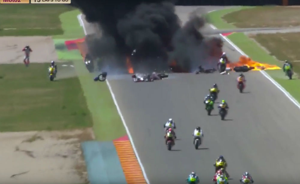 Uma queda na fase inicial da segunda corrida de Moto2 e Superstock 600 no circuito de Motorland em Aragón obrigou à interrupção da mesma. O norte-americano Michael Aquino e o italiano Jacopo Cretaro foram os dois principais pilotos envolvidos na mesma, entre outros sem consequências físicas, com tudo a acontecer na recta maior antes da derradeira dupla esquerda que dá acesso à recta da mesma quando após Xavi Cardelús ter perdido o controle da sua moto a mesma deslizou pela pista, com os outros dois envolvidos a embaterem na moto do espanhol que com a força do embate viu o depósito de combustível explodir numa imensa bola de fogo.