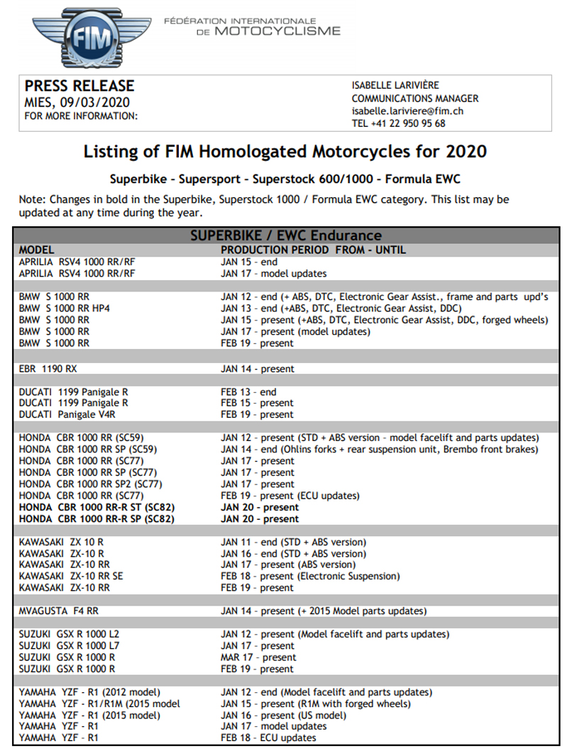 A Federação Internacional de Motorcyclisme (FIM) lançou as motos homologadas para todas as competições, incluindo o Superbike World Championship. Isto confirma a presença de todas as motos na grelha do Mundial de SBK, permitindo-lhes competir na vanguarda do Campeonato de Motociclismo de Motociclismo mais rápido.