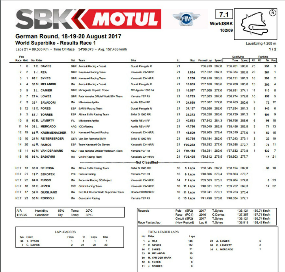 A primeira corrida do GP da Alemanha, que está a decorrer no circuito no circuito de Lausitzring, ficou marcada pela brilhante vitória de Chaz Davies (Ducati) que foi o mais forte na primeira corrida do fim de semana, batendo os pilotos da Kawasaki que saíram da primeira linha da grelha.