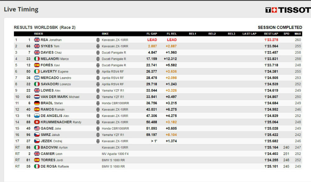 Na frente, Jonathan Rea alcançou a sua nona vitória da temporada, com Tom Sykes a ser segundo a 2,887s do vencedor, depois de a quatro voltas do final ter visto chegar na sua roda Chaz Davies, que acabou na terceira posição a 4,847s de Rea.