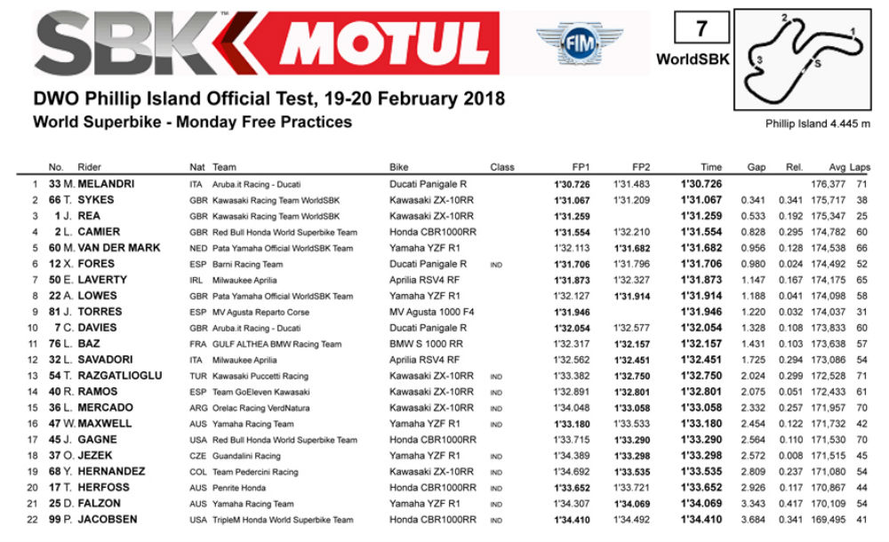 Já o Campeão do Mundo Jonathan Rea (Kawasaki), fechou o top três com 1m31,259s na frente de Leon Camier (Red Bull Honda WorldSBK Team), que foi outro dos protagonistas da sessão ao rodar em 1m31,554s.