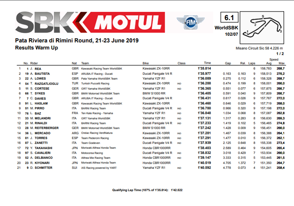Com Misano a amanhecer seco, ao contrário de boa parte de ontem, o Warm Up das SBK reiterou a aproximação dum duelo exclusivo a 2 entre Rea, vencedor da primeira manga, e Bautista, que foram os únicos pilotos a entrar no minuto 1:35, deixando mesmo Rea todos os outros a cerca de meio segundo, à exceção de Lowes, que ficou a 0,247 em 3º.