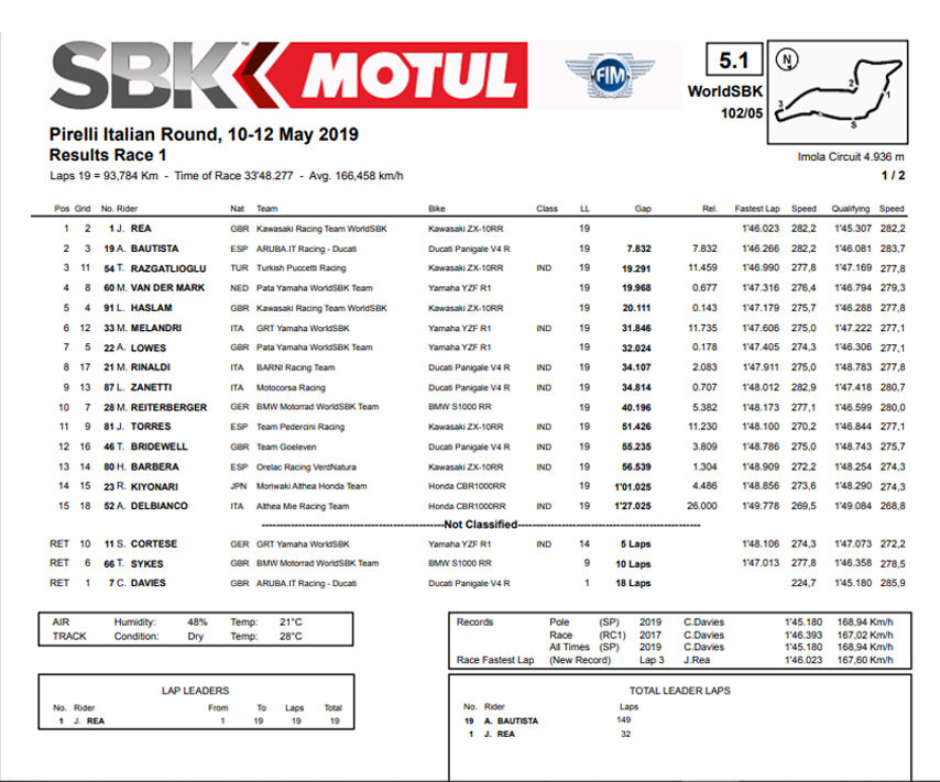 Com Sykes fora, seria o turco o homem forte deste grupo pois à medida que Lowes perdia terreno, a Kawasaki Pucetti com as cores da ELF veio para diante do grupo, após alguma troca de galhardetes com V D Mark. Foi o primeiro pódio do ano para Razgatlioglu, com Rea a cortar a meta mais de 8 segundos à frente de Bautista, depois de estabelecer novo recorde da volta em 1:46:023 ao longo das 19 voltas da provas.