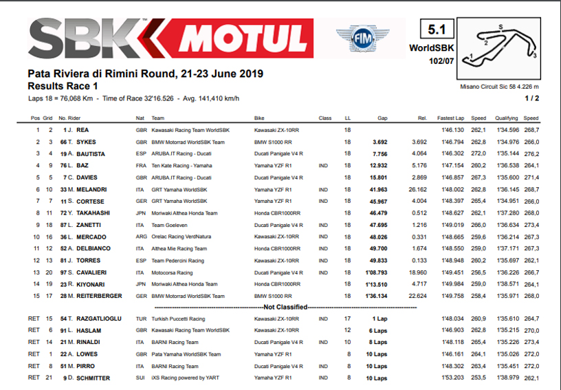 Desde a realização dos treinos de Qualificação, uma verdadeira borrasca veio abater-se sobre Misano, atrasando a partida da primeira manga e depois interrompendo a corrida às 3 voltas quando Lowes Rea liderava sobre Rea, Sykes, Bautista e Davies. Reformada a grelha com Lowes a sair da pole, o novo arranque viu primeiro Rea, Cortese e Sykes à frente, vindo gradualmente Lowes de trás para se colar à Kawasaki do Nº1.