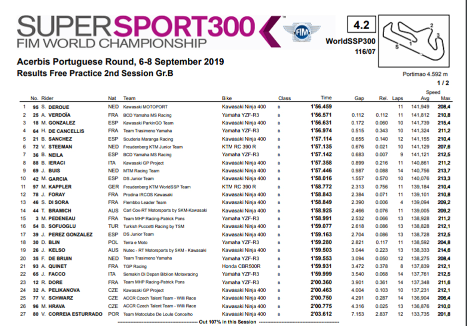 Seria a motivação de saber que há tão poucos holandeses na grelha? Seja o que for, desta Scott Deroue saltou para a frente da sessão Livre B das SSP 300 e foi aguentando as investidas de Verdoia, anterior líder, Gonzalez, DeCancellis, Sanchez e Steeman, este uma KTM solitária num mar de Kawasaki e Yamaha que se estendiam até à 14ª posição da 2ª KTM de Kappler.