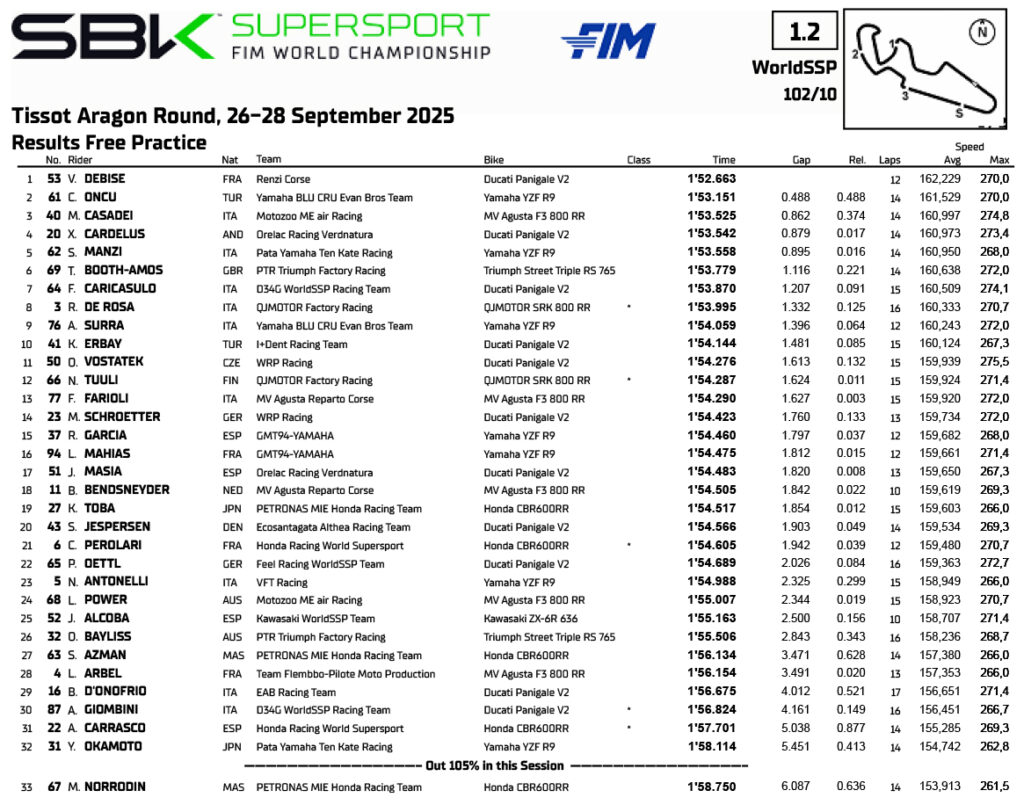 Foi um resultado algo estranho da primeira sessão das Supersport em Aragão, considerando que o líder do Campeonato, que raramente deixa os seus créditos por mãos alheias acabou a sessão apenas em 5º, a 0,895s do tempo dominante de 1:52.663 de Valetin Debise, que o teria qualificado para a grelha de Superbike.