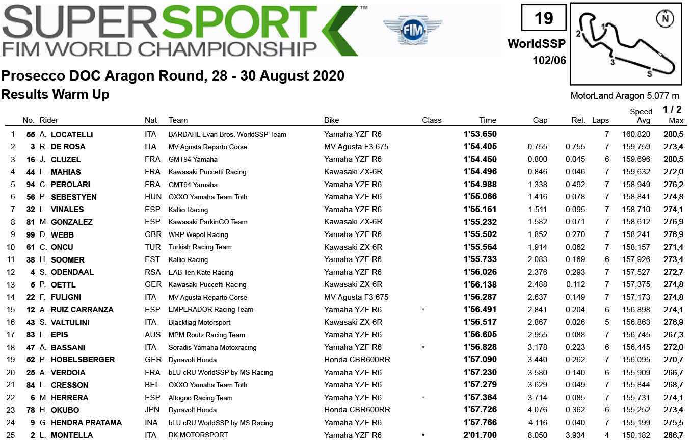 A surpresa do Warm Up das Supersport, com Locatelli inevitavelmente no comando na Yamaha da Evan Bros., foi encontrar a MV Agusta de Rafaele De Rosa na segunda posição, embora a 755 milésimas do italiano da Yamaha.