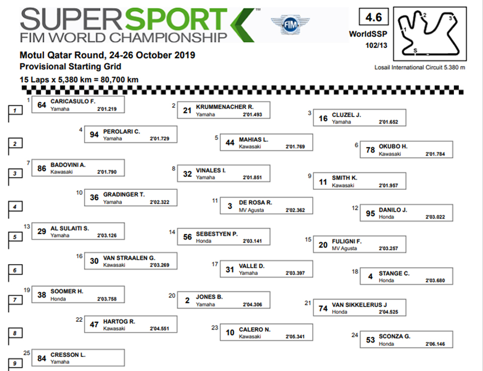 Quando contava mesmo, a luta pelo título de Supersport entre os dois rivais e colegas da Yamaha Evan Bros. Caricasulo e Krummenacher foi reeditada na Superpole, com o Suiço a ficar a 0,274 da pole do Italiano e ambos a deixar o dominador dos treinos livres Cluzel a 0,4s.