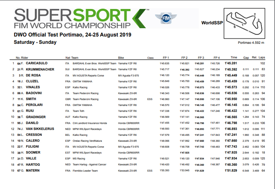 O suíço trabalhou para melhorar a sensação com a frente da sua R6, testando também as suas condições físicas. Krummenacher regressou ao asfalto de Portimão depois de sofrer uma ligeira lesão no joelho no início dos dois meses de férias de verão, mas agora parece ter recuperado totalmente.