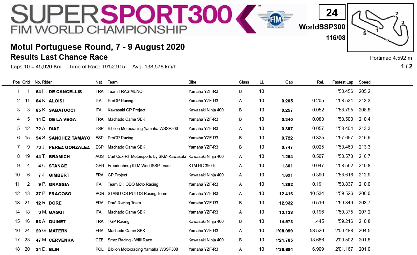 Primeiro, começou por descer 3 lugares em outras tantas voltas na sua Yamaha R3, mas depois na 8ª volta da corrida de 10 voltas, subiu posições de novo, encetando uma batalha com Dore que tinha vindo de trás, e passando-o para voltar ao seu lugar original de 12º, onde acabou à testa do segundo grupo, separado dos da frente por cerca de 10 segundos…