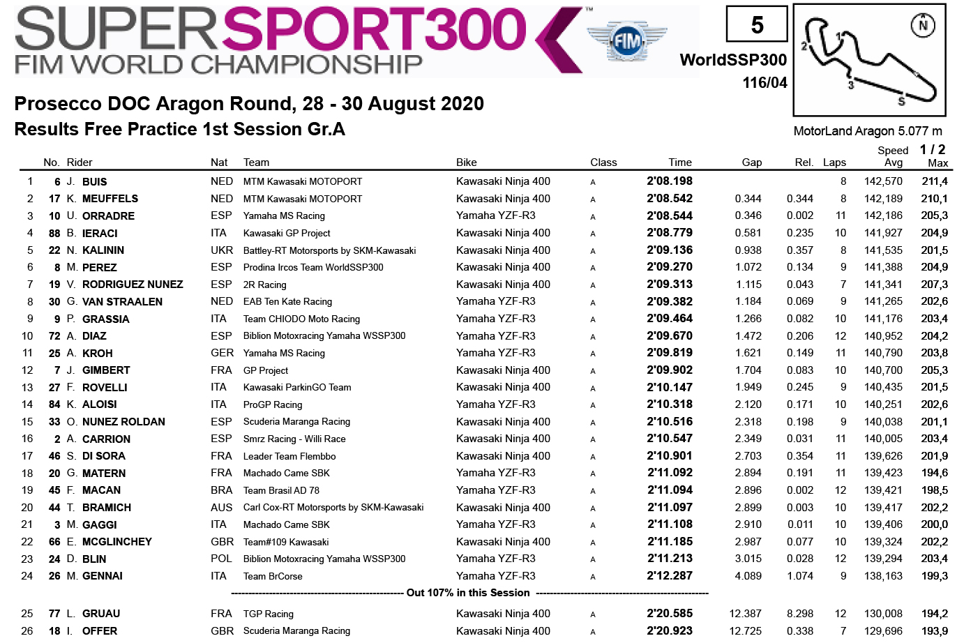 O Holandês Jeffrey Buys acabou à frente da sessão livre inicial do Grupo A das Supersport 300 na sua Kawasaki após disputar a primazia da volta mais rápida com alguns dos habituais de classe do seu grupo como Meuffels, Orradre, Ieracci e Kalinin.