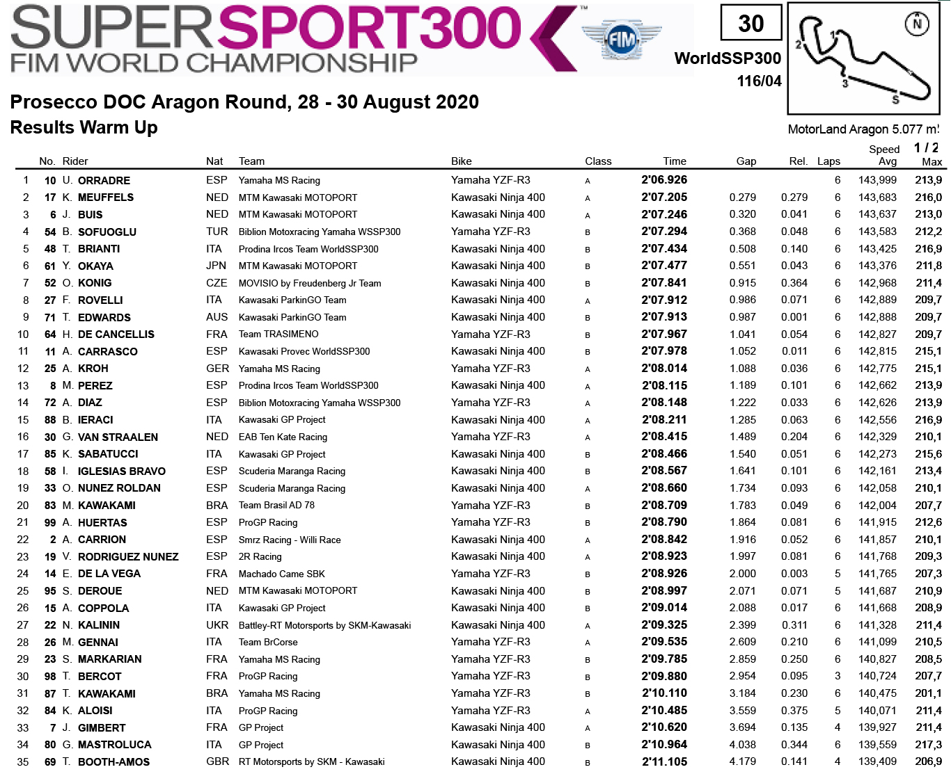 Depois de animada disputa ao longo de 20 minutos Unai Orradre da Yamaha liderou o warm up sobre Meuffels e Buis da Kawasaki Motoport, com Sofuoglu a aparecer em quarto e muitos dos regulares afundados na classificação, como Edwards em 9º, De Cancellis em 10º e Ana Carrasco em 11º.