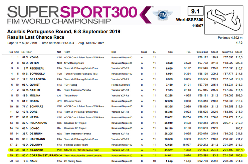 Já mesmo pelo número de concorrentes habituais, em excesso de 50, a organização divide-os em 2 grupos e faz uma corrida (A corrida Last Chance) para os que ficam de fora dos primeiros 15 de cada Grupo… Assim assegurados pelo menos uma participação, os dois portugueses alinharam Sábado à tarde e acabaram por encetar uma luta a dois como se estivessem no nacional. Ao fim de várias trocas de posição, o Algarvio Esturrado detinha a vantagem, até que, ao ambicionar ganhar um lugar mais à frente, foi apertado por Delouvy e depois de uma excursão fora de pista, acabou atrás de Fragoso em 19º… esperemos que seja o prenúncio de mais internacionalizações!