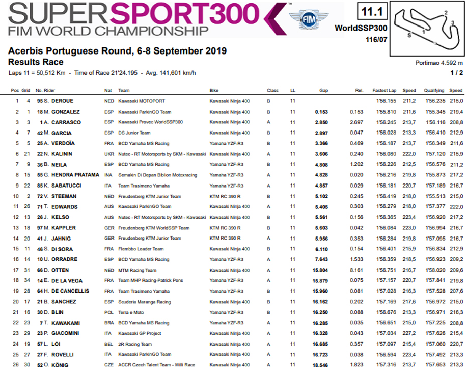 Nas pequenas Supersport 300, com o título já decidido desde Magny-Cours a favor de Manuel Gonzalez, discutia-se ainda o vice- campeonato, entre Scott Deroue e a até aqui incumbente Ana Carrasco, que chegaram a Doha empatados com 106 pontos cada um.