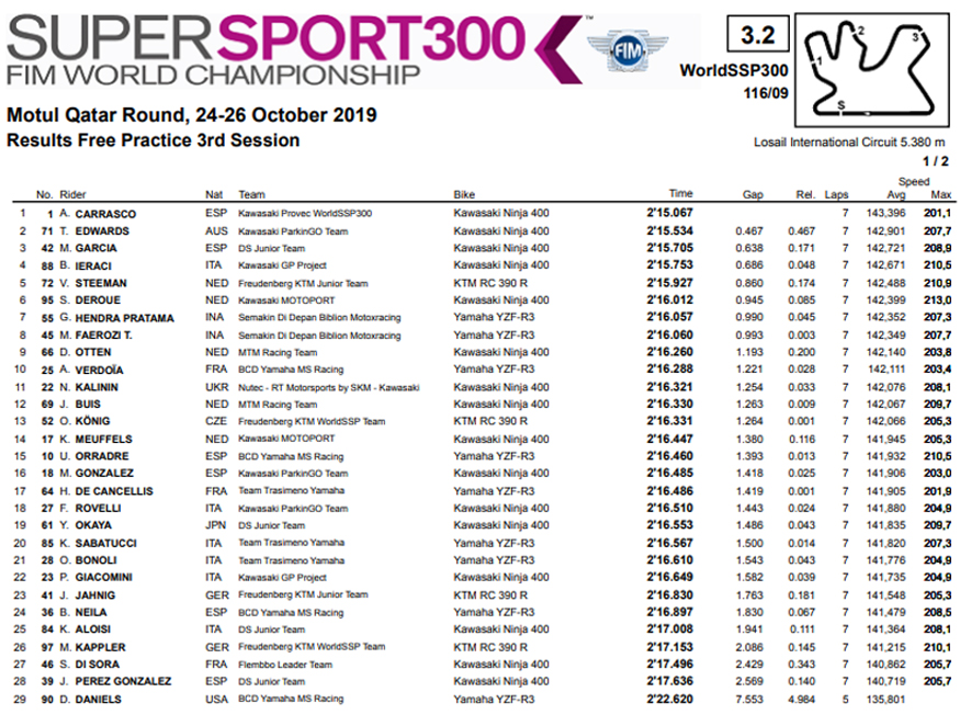Com apenas 7 voltas na sessão, não havia muito tempo, mas também não há muito a ajustar nas pequenas SSP300, com o resto do Top 10 a apresentar a seguir Steeman na KTM outra Kawasaki com Deroue, depois Pratama, primeira Yamaha, seguido do Indonésio Ferozi, Otten e Verdoia.