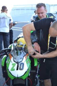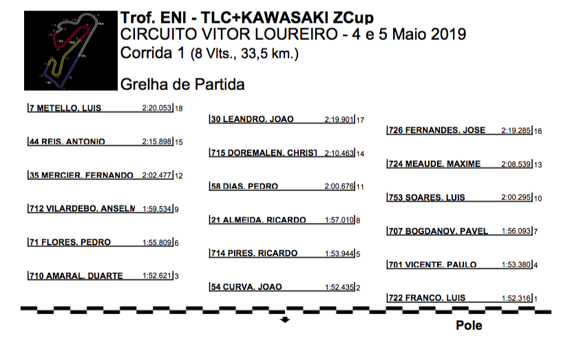 Mas vamos às corridas que ficaram também marcadas pela Pole Position logo obtida por um piloto do Troféu ZCUP, Luís Franco, com um tempo de 1.52.316 na frente da Yamaha R1 de João Curva do Troféu ENI/TLC e seguido por Duarte Amara com a Z10 também no segundo 52 e que fechavam a primeira linha da grelha de partida. Paulo Vivente e Ricardo Pires, ambos no segundo 53 vinham logo a seguir na 2ª linha a par de Pedro Flores já no segundo 55. Bogdanov com a Z07 tem vindo a subir de rendimento e a consegiue um tempo nos 57 na frente de Vilardebó e Soares nos 59. Fernandes fechava o grupo das Z’s com a moto ainda em rodagem e a participar pela primeira vez numa prova do troféu.