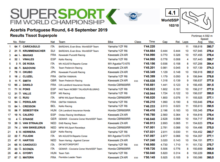 Quando a sessão terminou, Caricasulo tinha alcançado a pole, à frente de Krummenacher e Viñales. No entanto, ainda havia muitas oportunidades de mudança, já que a carga da Kawasaki era forte, liderada por Lucas Mahias (Kawasaki Puccetti), com Ayrton Badovini (Team Pedercini), Hikari Okubo (Kawasaki Puccetti) e Kyle Smith, todos alinhados atrás do trio de Yamahas na frente.